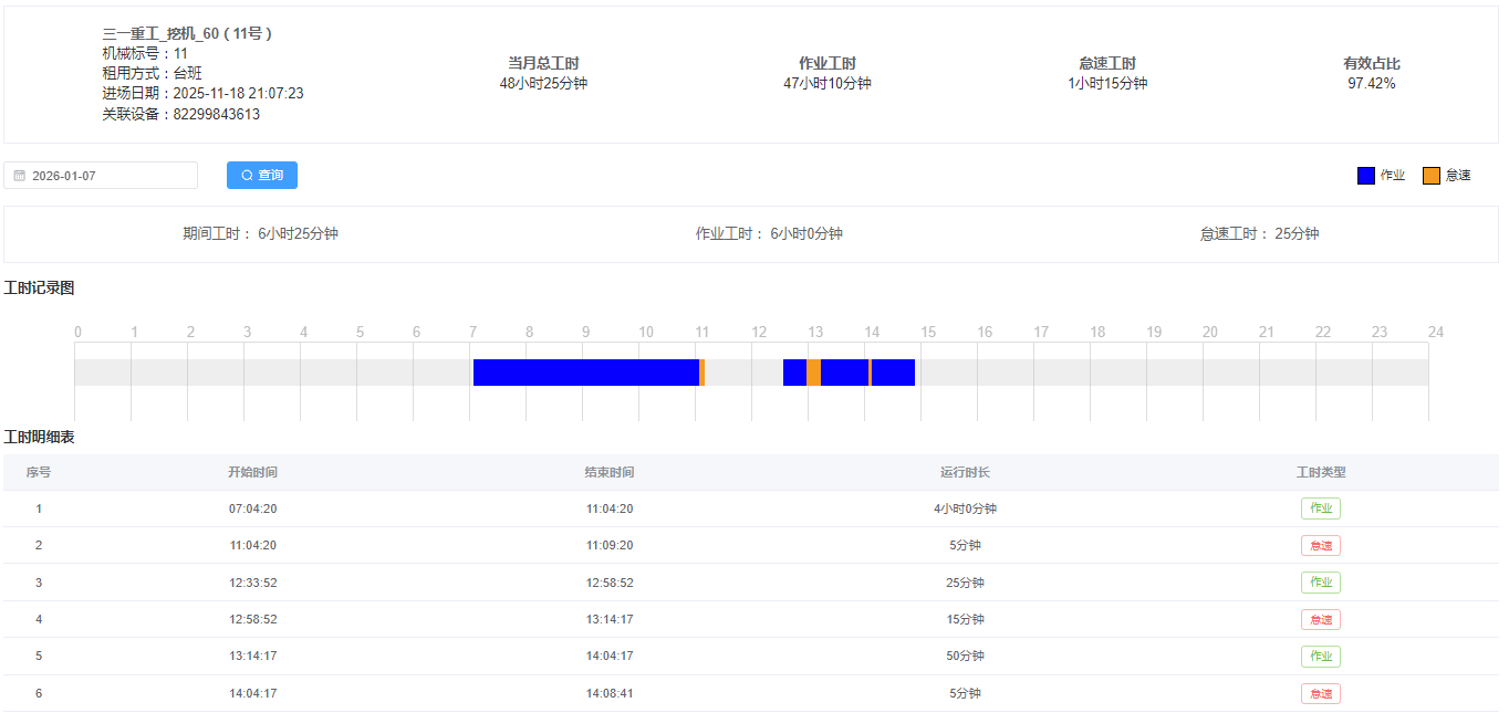 6、完整记录机械运行过程,自动生成工时报表,随时校对随时复核,费用结算更准确。