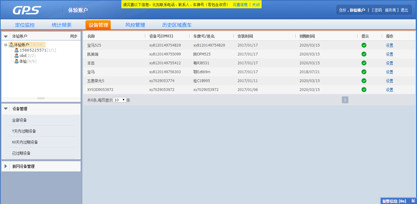 设备管理 实现对车载终端信息的管理以及驾驶员的管理 通过系统即可查询到该信息 |